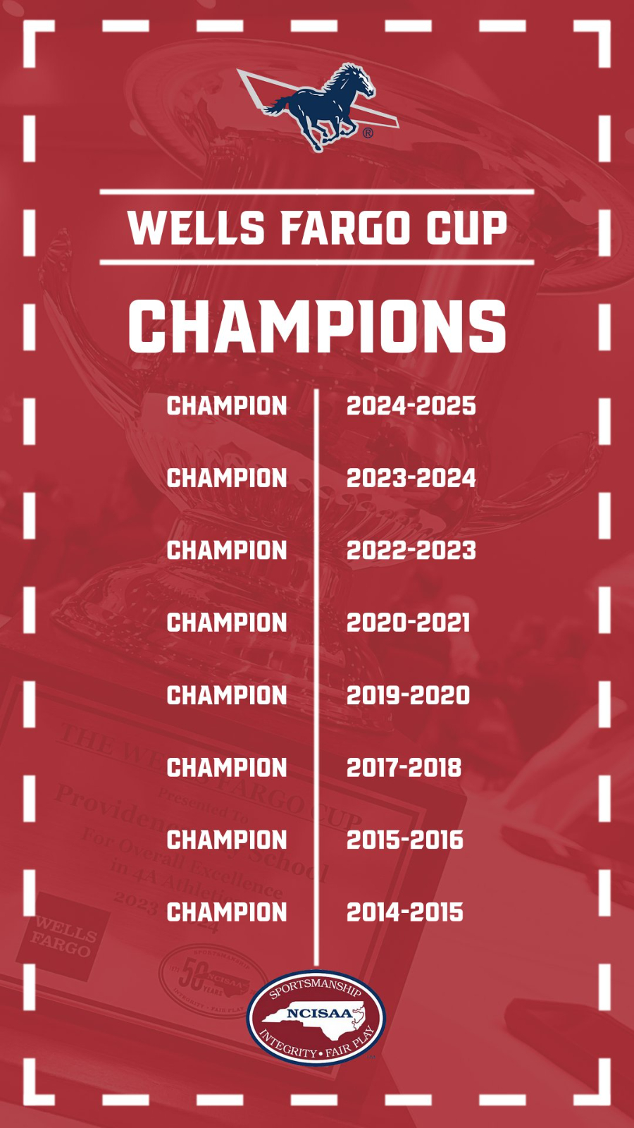 The Wells Fargo Cup, presented and sponsored by Wells Fargo Bank, N.A., recognizes overall excellence in high school athletics among NCISAA member institutions.